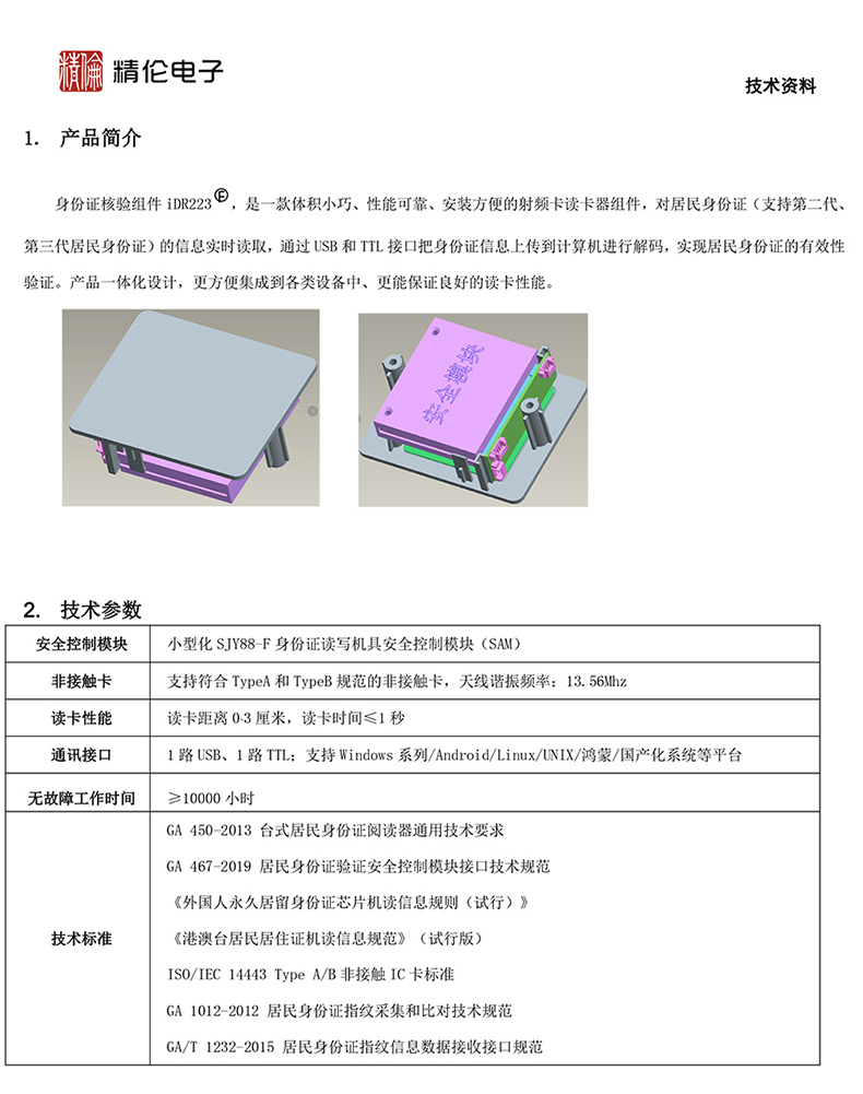 (*由于產(chǎn)品升級或其他原因,精倫IDR223身份證組件產(chǎn)品實際參數(shù)有可能變更,以實際產(chǎn)品為準。本文中的所有陳述、信息和建議也不構成任何明示或暗示的擔保)