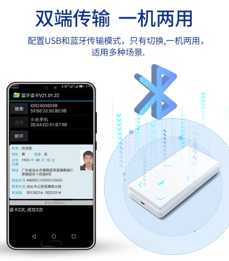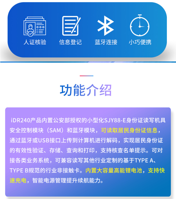 精倫Idr240產(chǎn)品是一款多功能射頻卡讀卡器,支持藍(lán)牙,有線雙端接入。產(chǎn)品內(nèi)置公安部授權(quán)的身份證讀寫機具安全控制模塊(SAM)和藍(lán)牙模塊,可讀取居民身份證信息,通過藍(lán)牙或USB接口上床到計算機進行解碼,實現(xiàn)居民身份證有效性驗證,查詢和打印,支持核查名單提示。可對接各類業(yè)務(wù)系統(tǒng),可兼容讀寫基于TypeA,TypeB規(guī)范的行業(yè)非接觸卡。內(nèi)置大容量高能鋰電池,支持快速充電,只能電源管理提升續(xù)航能力。